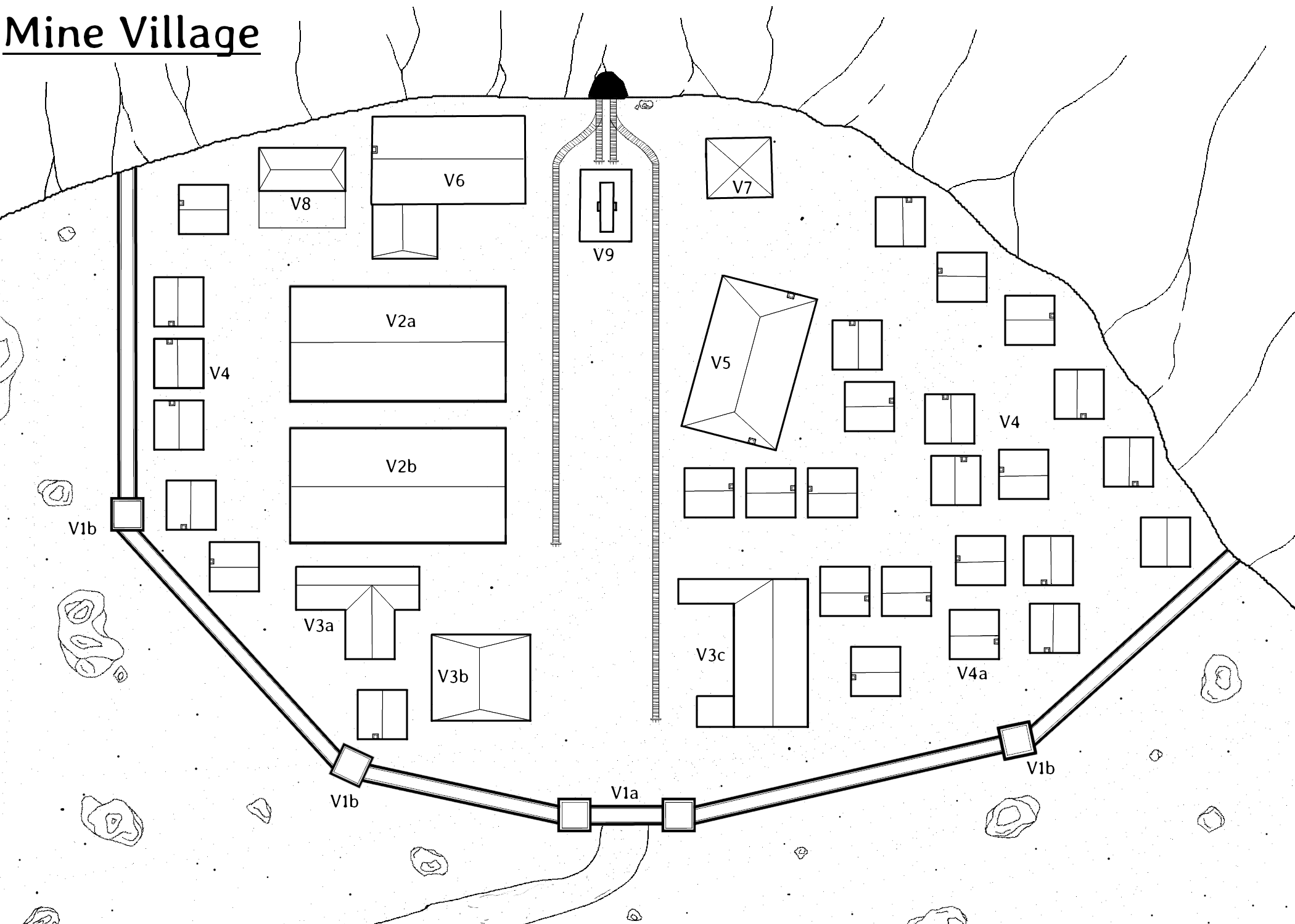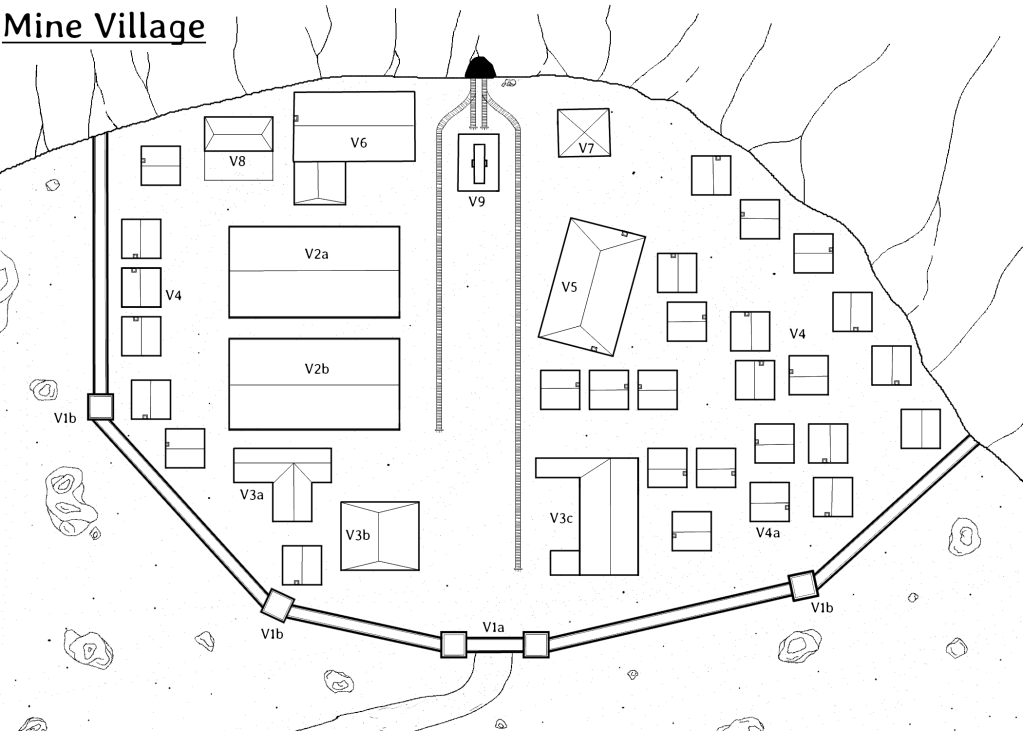 The village itself is pretty spartan. Most of the buildings are small cabins or bunk houses (V4) for the miners. There are large warehouses for storing ore (V2a and V2b), the overseers office (V6), a pub (V5), and the windlass (V9) that is used to drive mine cart traffic in and out of the mine.