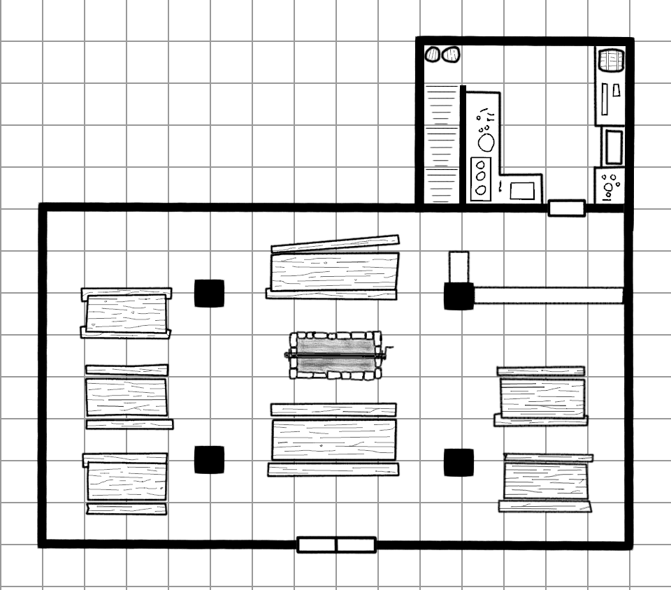 The Common Room of the Wayward Stag is a large rectangular room, with the longer direction oriented East-West. Several long tables with benches line each side of the room and the center of the room is dominated by a large open hearth. Double doors in the south wall wall lead out to the street. The bar is located along the north wall with a small doorway behind it leading into the kitchen beyond. The clientele of the Stag is usually well behaved for being in this part of town, but in the wee hours of the morning it’s not uncommon for a few drunken scuffles to occur.